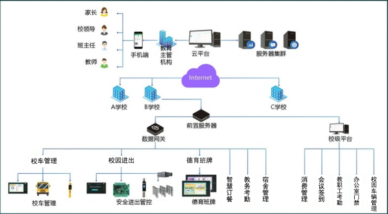 消费类应用:满足中小学食堂、超市、水控等各项校园消费需求 门口出入类应用:为适应学校的不同需求,提供多种产品组合方案